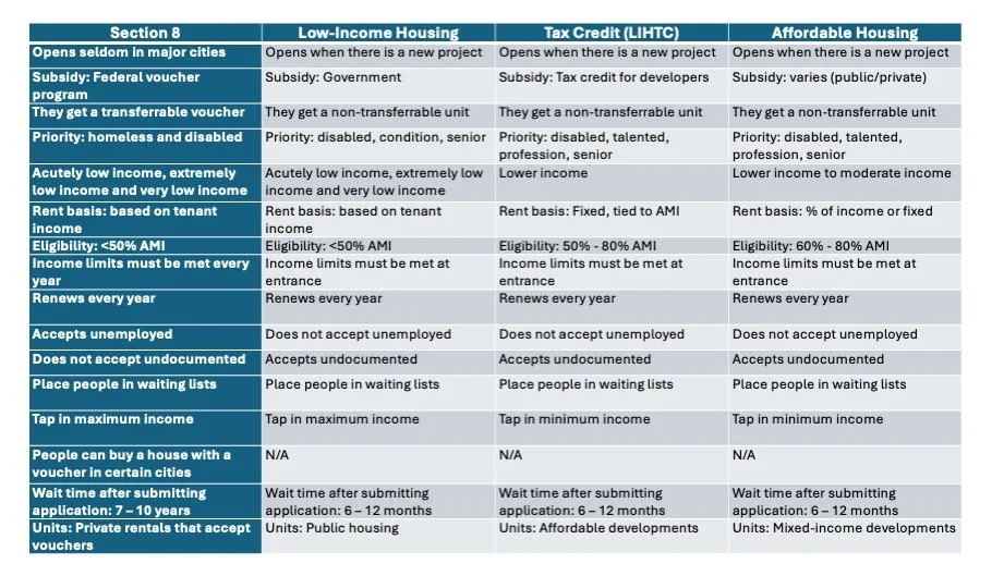If suitable housing options are not available at the time of the appointment, provide education on the different types of low-income housing programs. I